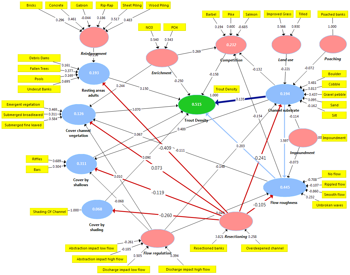 Each causal arrow is associated with a standard coefficient representing impact on a scale of -1 (high negative impact) to +1 (high positive impact). The numbers displayed in the LVs oval shapes represent R2 values, i.e. the amount of variability explained by the LVs predicting them. In our case, 51.5% of trout density variability could be explained by the model.